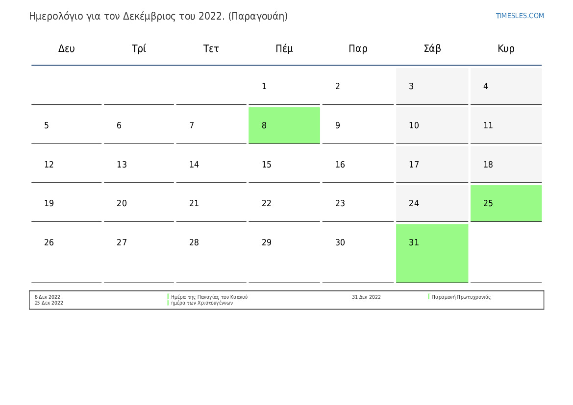 Ημερολόγιο Δεκέμβριος 2022 για την Παραγουάη
