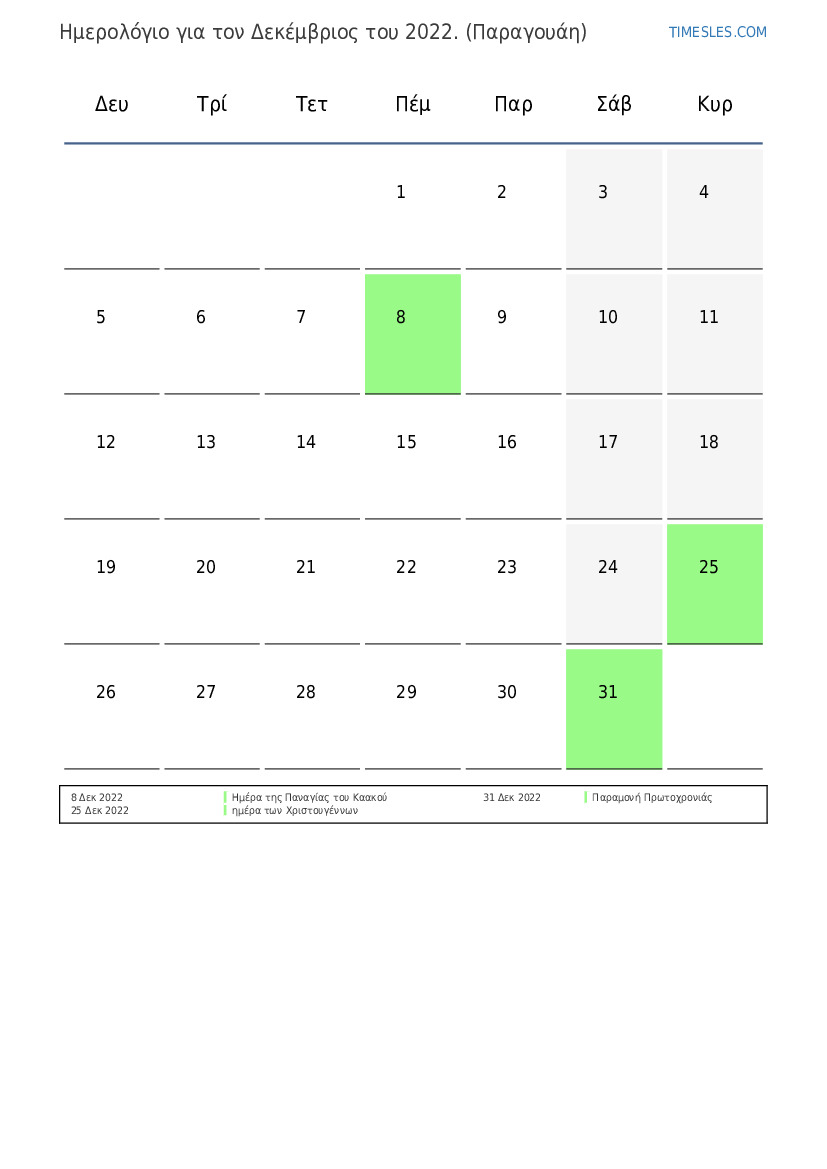 Ημερολόγιο αργιών και Σαββατοκύριακων για το Δεκέμβριος του 2022 για την Παραγουάη