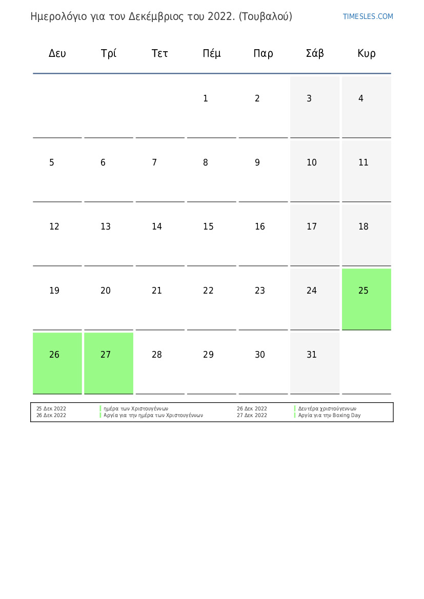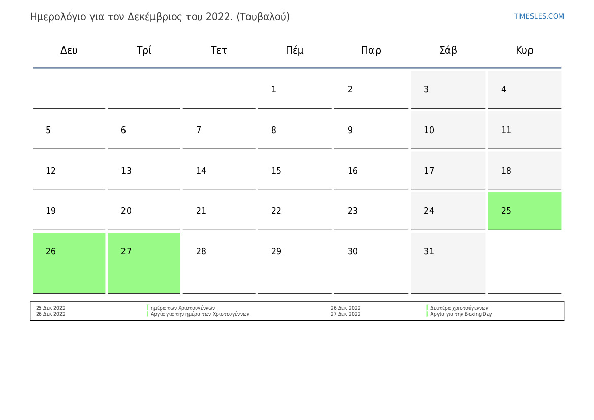 Ημερολόγιο αργιών και Σαββατοκύριακων για το Δεκέμβριος του 2022 για το Τουβαλού