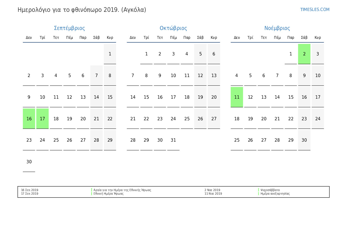 Ημερολόγιο αργιών και σαββατοκύριακων για το φθινόπωρο του 2019 για την Αγκόλα