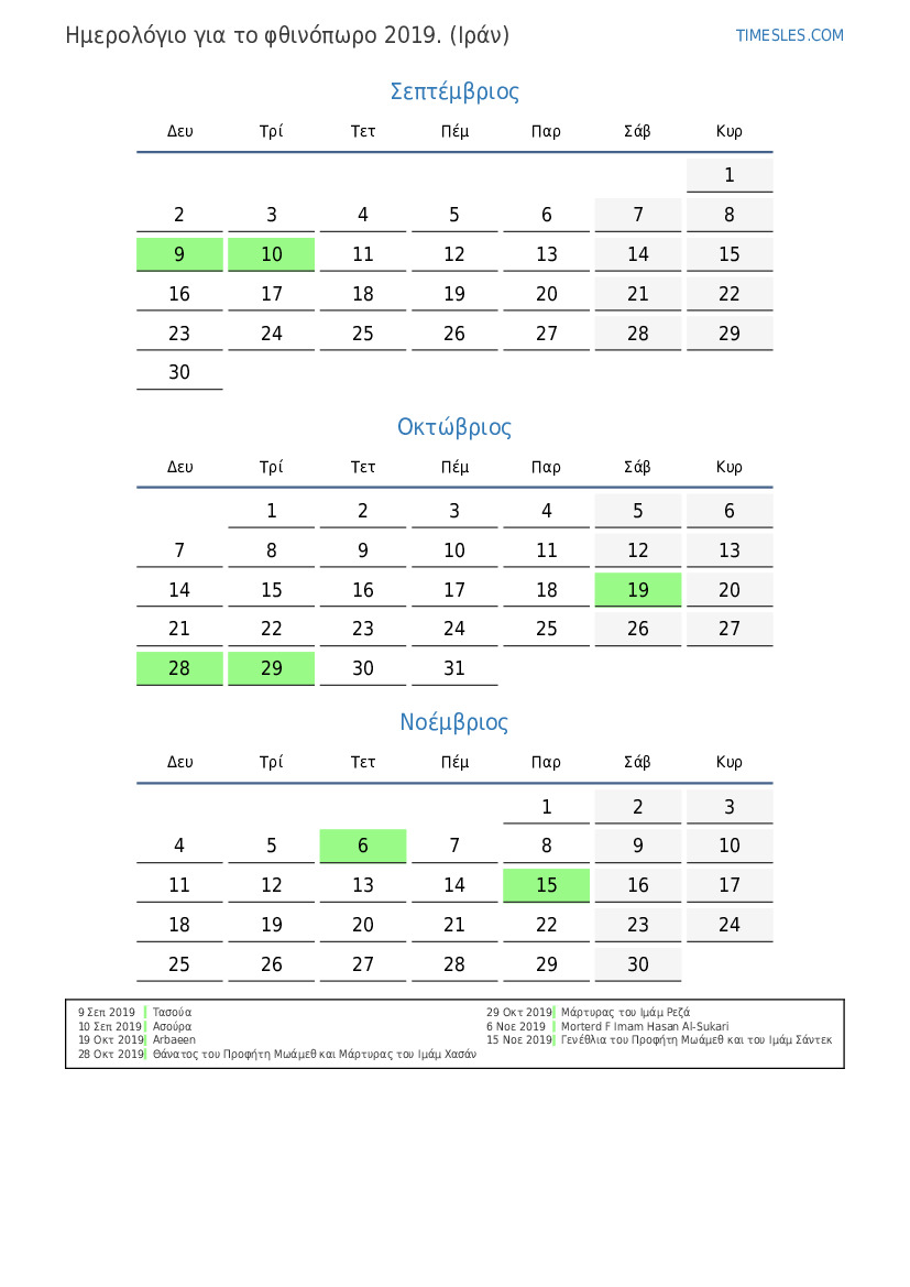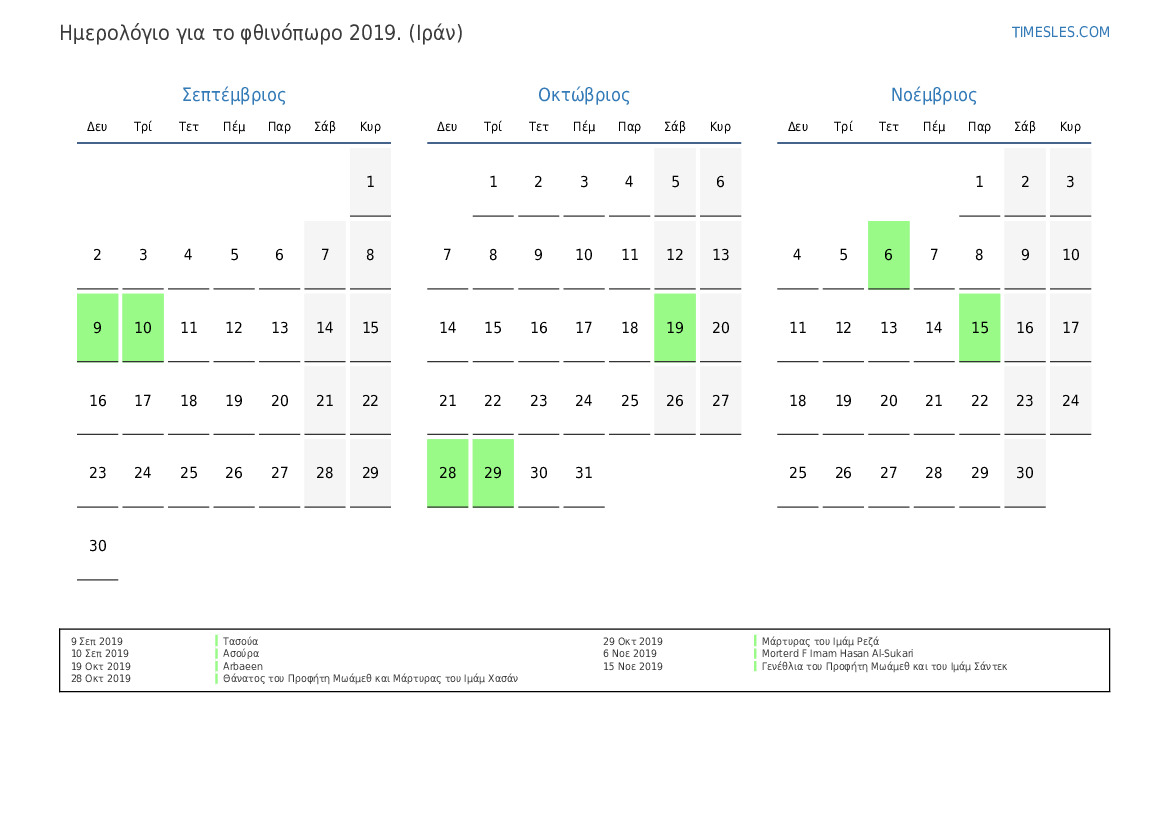 Ημερολόγιο αργιών και σαββατοκύριακων για το φθινόπωρο του 2019 για το Ιράν