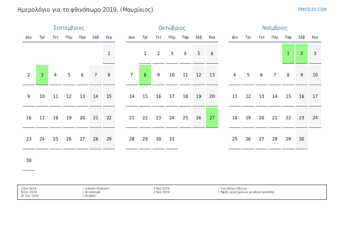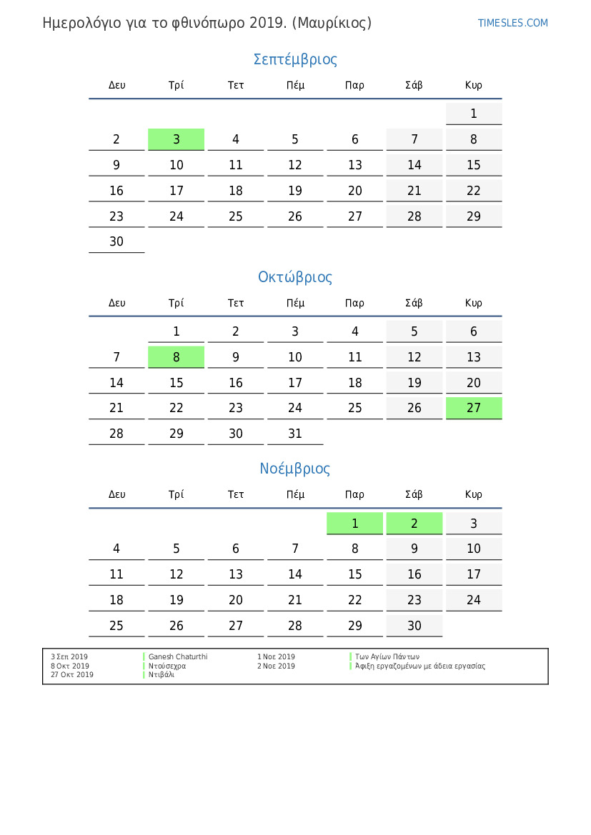 Λήψη και εκτύπωση ημερολογίου PDF με αργίες και σαββατοκύριακα για το φθινόπωρο του 2019 για τον Μαυρίκιο