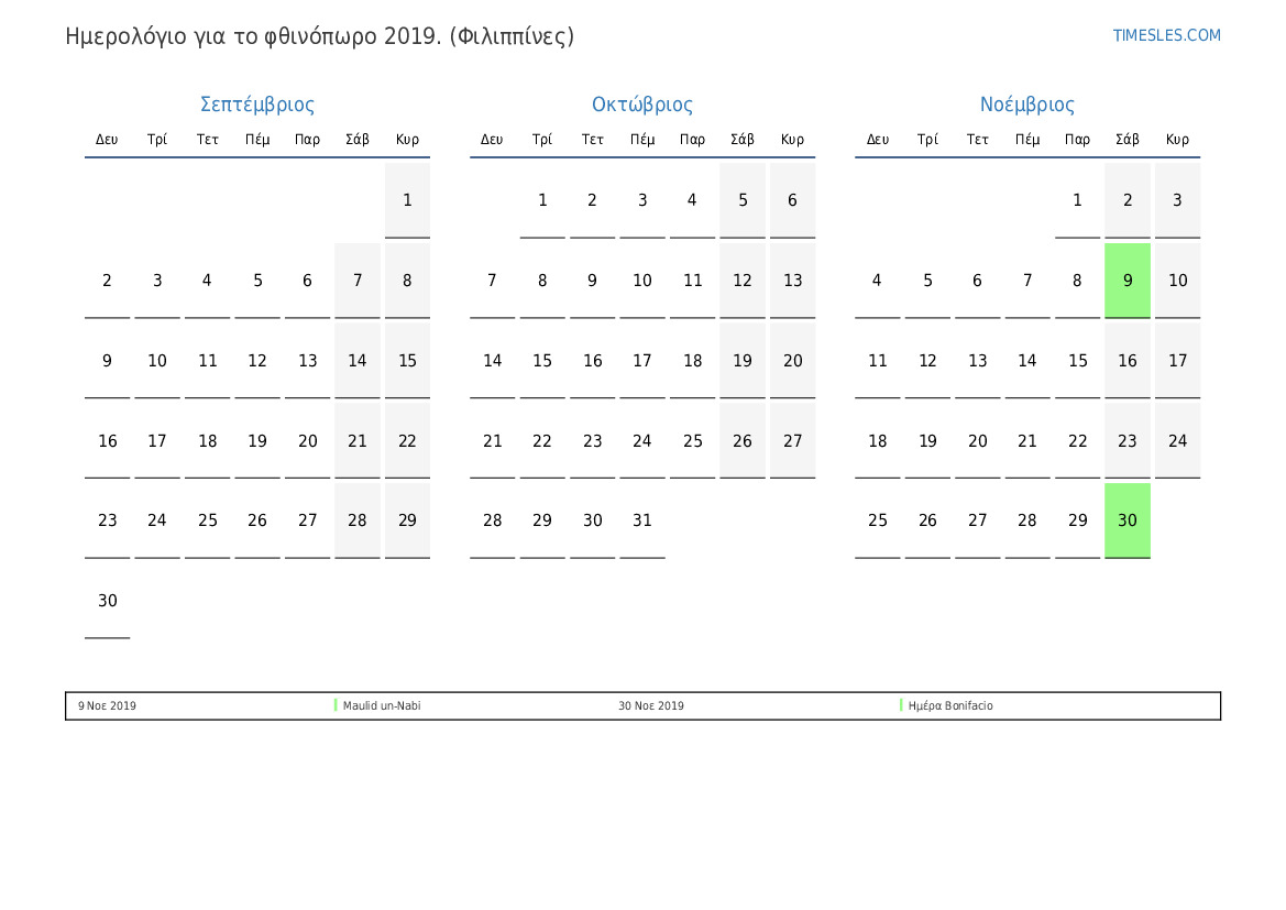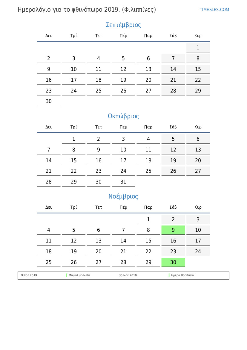 Λήψη και εκτύπωση ημερολογίου PDF με αργίες και σαββατοκύριακα για το φθινόπωρο του 2019 για τις Φιλιππίνες