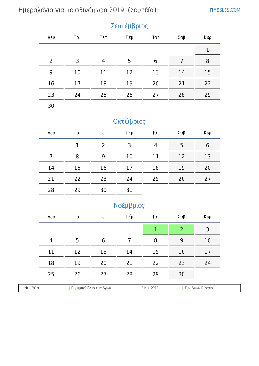Λήψη και εκτύπωση ημερολογίου PDF με αργίες και σαββατοκύριακα για το φθινόπωρο του 2019 για τη Σουηδία