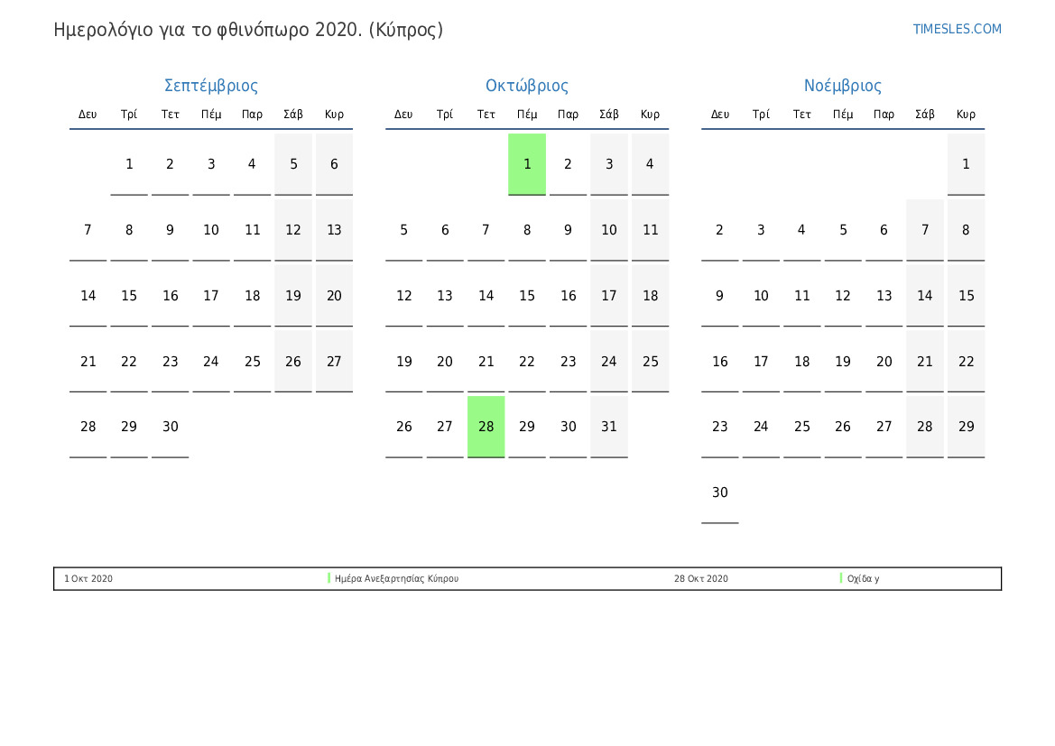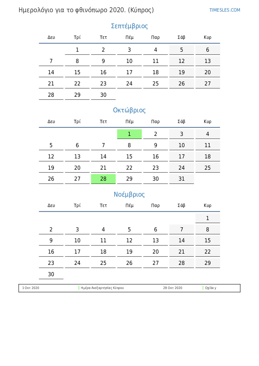 Λήψη και εκτύπωση ημερολογίου PDF με αργίες και σαββατοκύριακα για το φθινόπωρο του 2020 για την Κύπρο