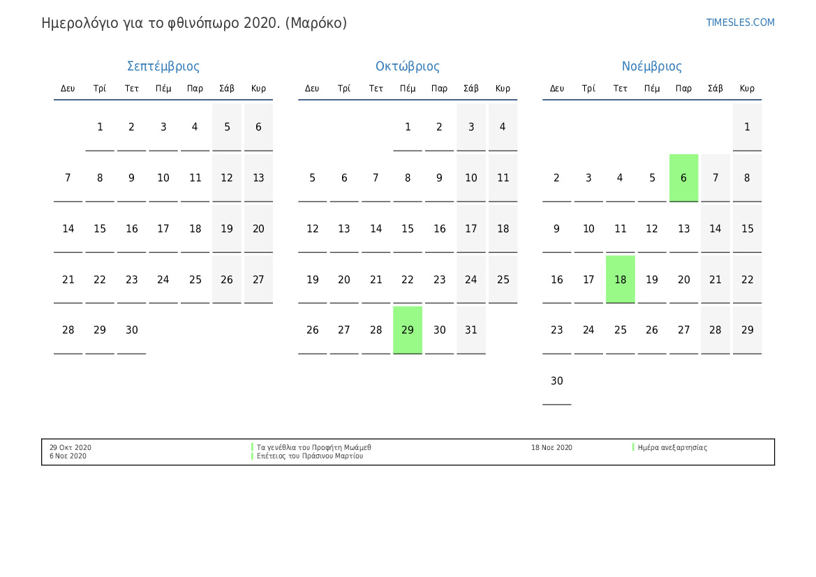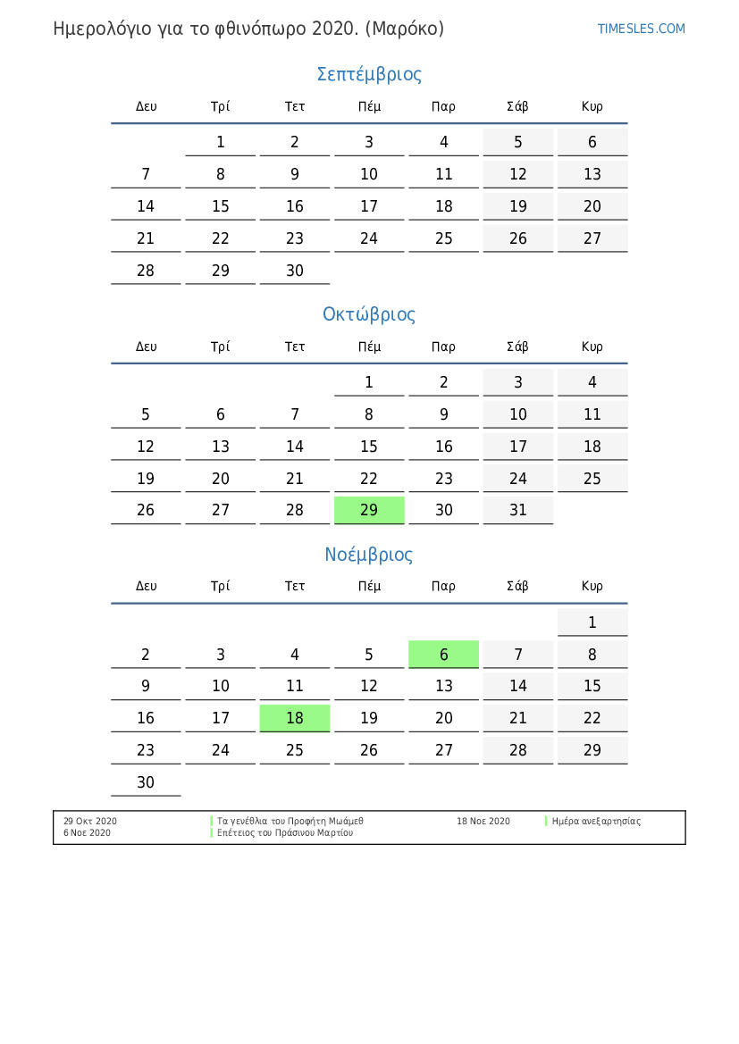 Ημερολόγιο για το φθινόπωρο 2020 για το Μαρόκο