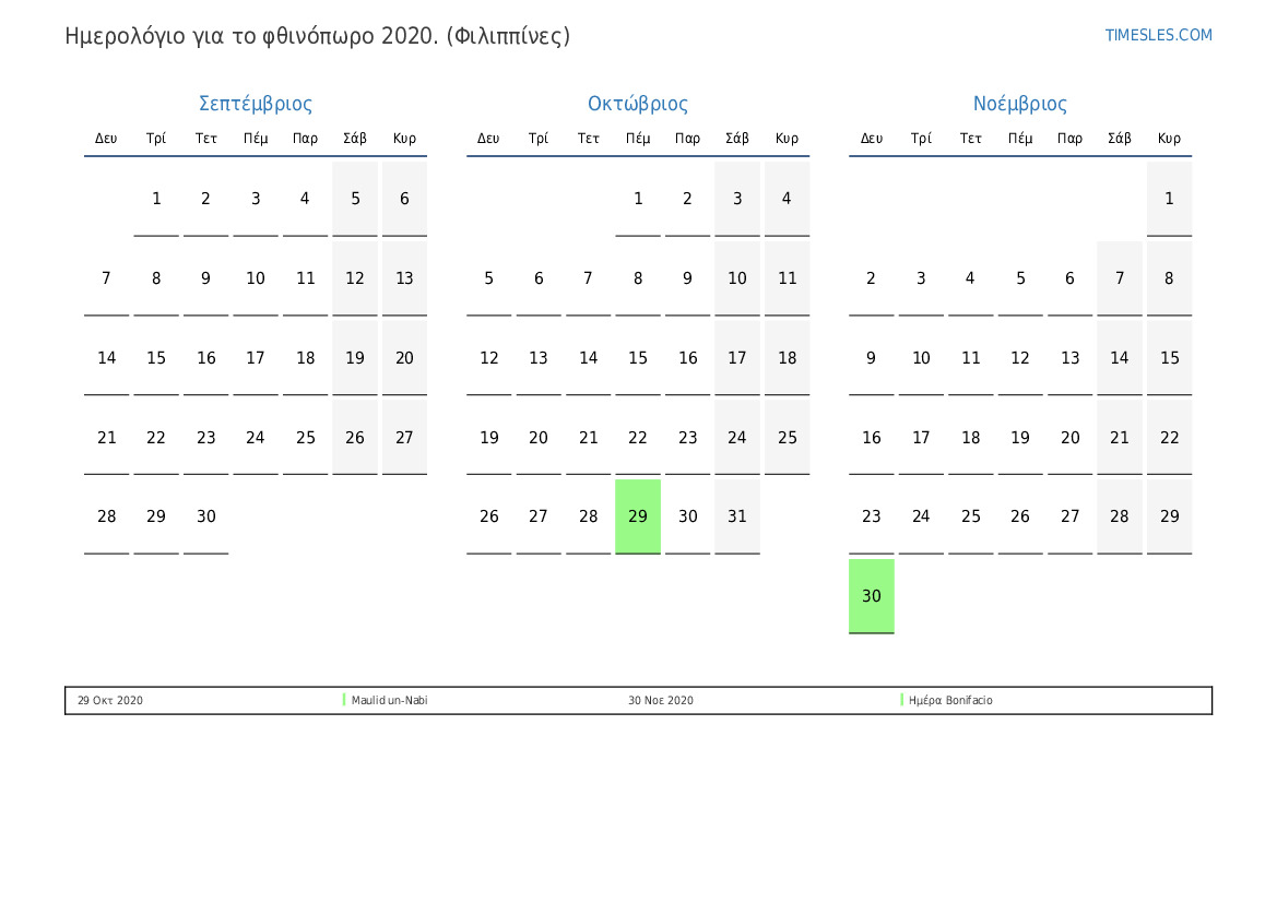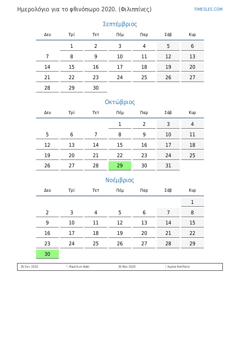 Λήψη και εκτύπωση ημερολογίου PDF με αργίες και σαββατοκύριακα για το φθινόπωρο του 2020 για τις Φιλιππίνες