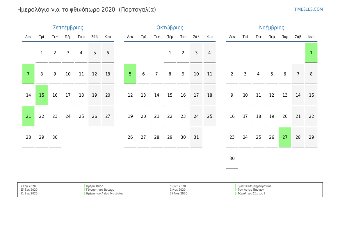 Λήψη και εκτύπωση ημερολογίου PDF με αργίες και σαββατοκύριακα για το φθινόπωρο του 2020 για την Πορτογαλία
