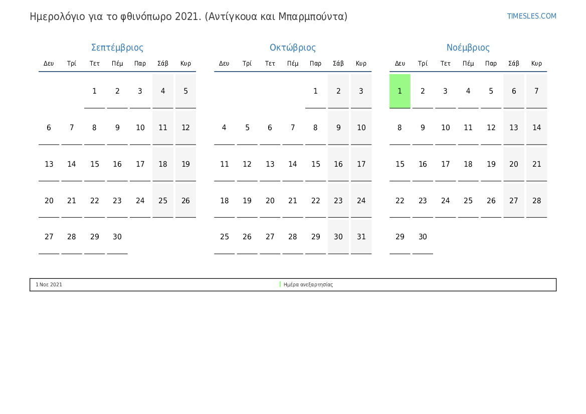 Ημερολόγιο αργιών και σαββατοκύριακων για το φθινόπωρο του 2021 για Αντίγκουα και Μπαρμπούντα
