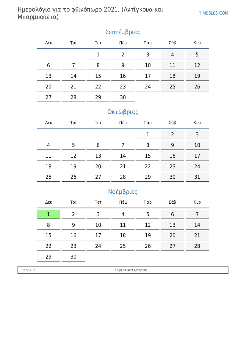 Ημερολόγιο για το φθινόπωρο 2021 για Αντίγκουα και Μπαρμπούντα