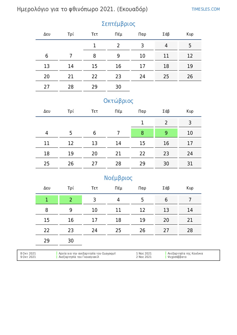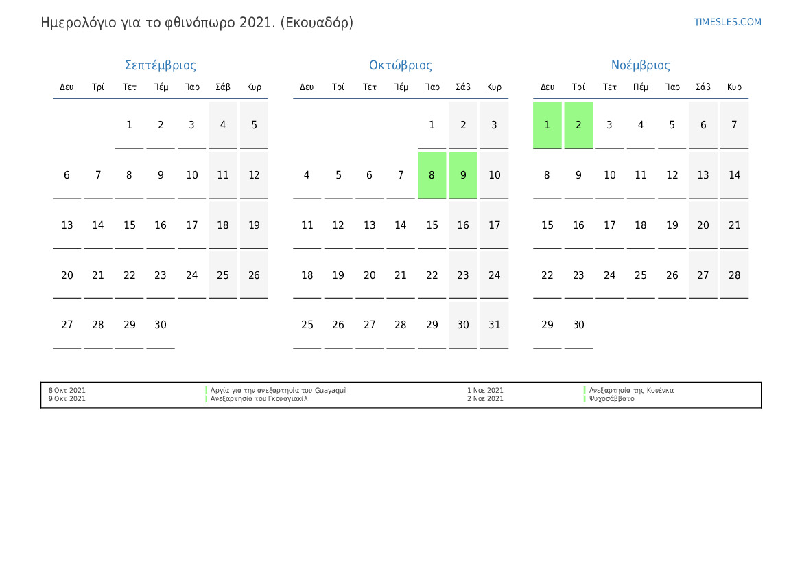 Ημερολόγιο αργιών και σαββατοκύριακων για το φθινόπωρο του 2021 για τον Ισημερινό