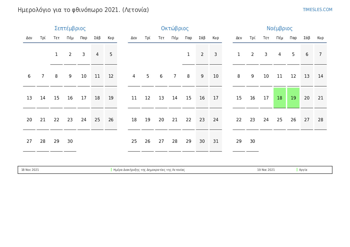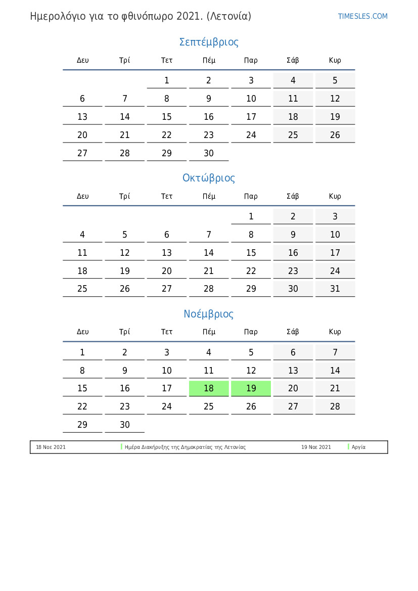 Λήψη και εκτύπωση ημερολογίου PDF με αργίες και σαββατοκύριακα για το φθινόπωρο του 2021 για τη Λετονία