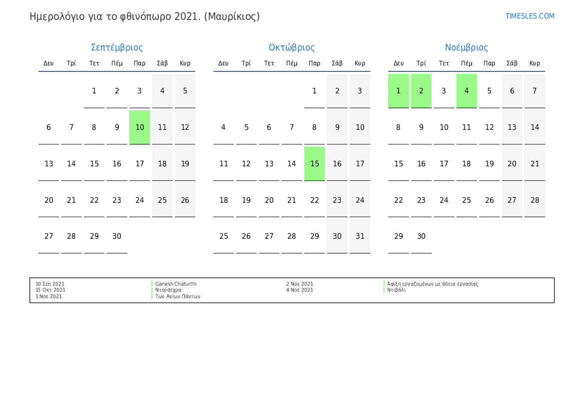Λήψη και εκτύπωση ημερολογίου PDF με αργίες και σαββατοκύριακα για το φθινόπωρο του 2021 για τον Μαυρίκιο