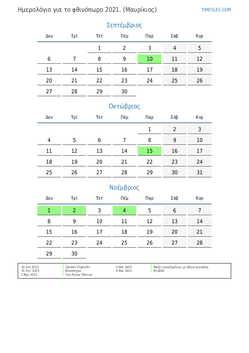 Ημερολόγιο για το φθινόπωρο 2021 για τον Μαυρίκιο