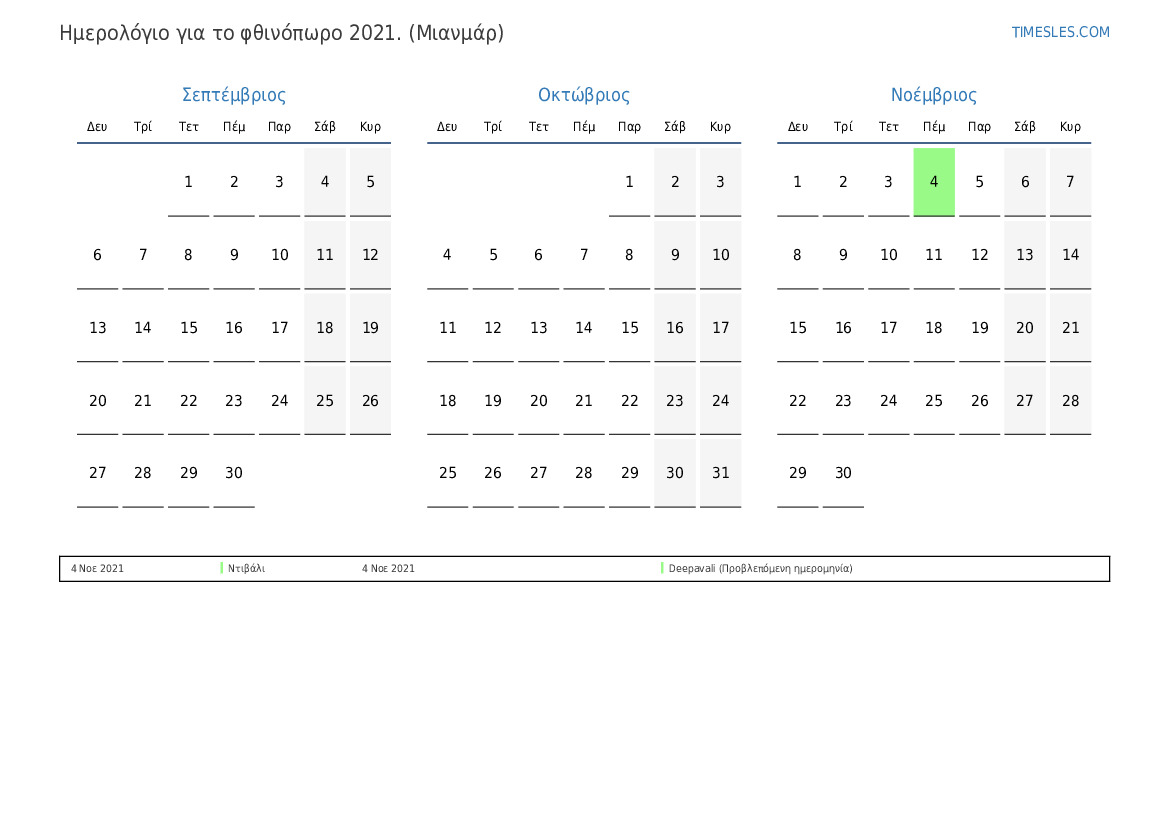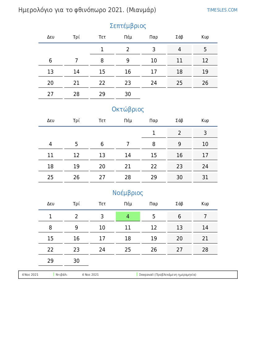Ημερολόγιο για το φθινόπωρο 2021 για τη Μιανμάρ