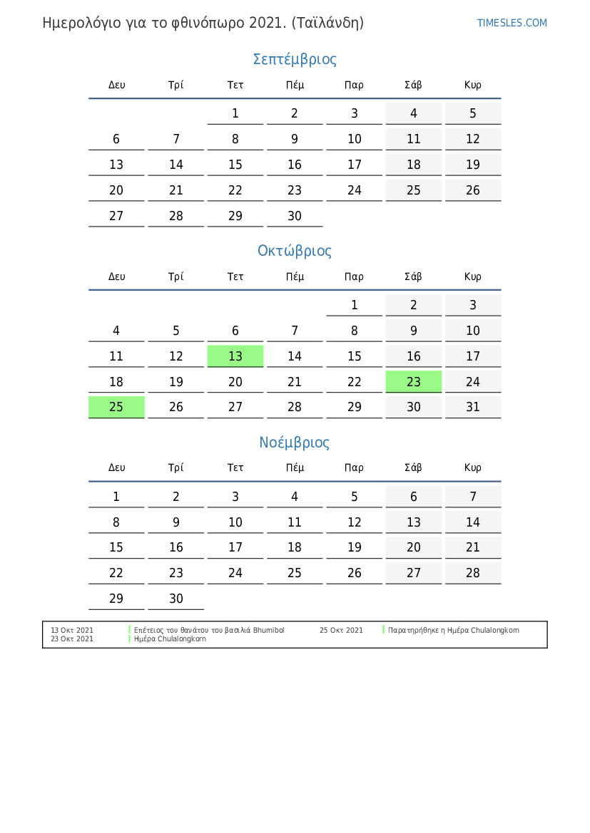 Λήψη και εκτύπωση ημερολογίου PDF με αργίες και σαββατοκύριακα για το φθινόπωρο του 2021 για την Ταϊλάνδη