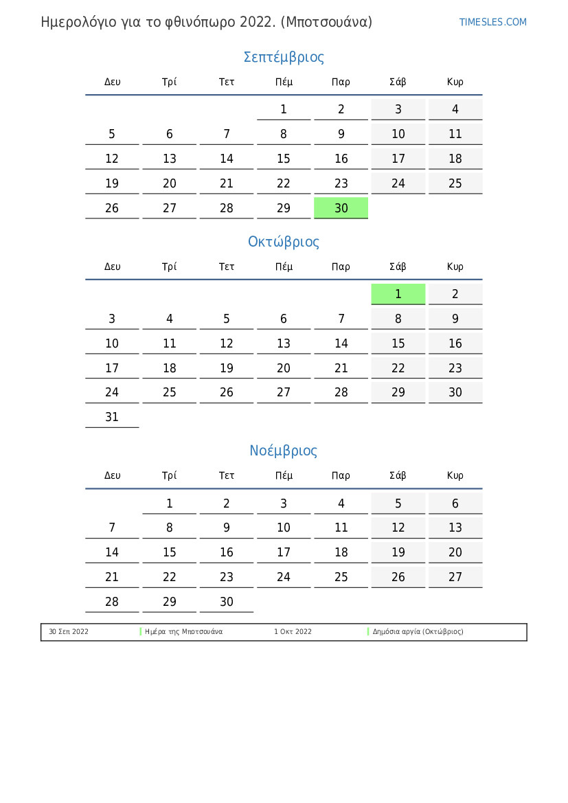 Λήψη και εκτύπωση ημερολογίου PDF με αργίες και σαββατοκύριακα για το φθινόπωρο του 2022 για την Μποτσουάνα