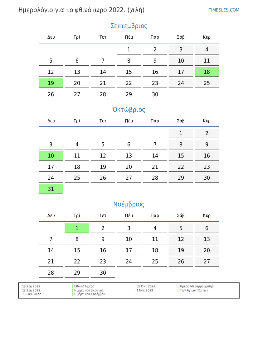 Ημερολόγιο αργιών και σαββατοκύριακων για το φθινόπωρο του 2022 για τη Χιλή