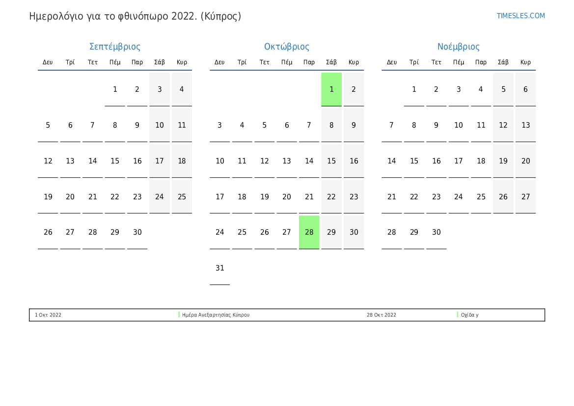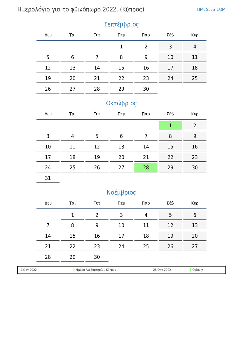 Λήψη και εκτύπωση ημερολογίου PDF με αργίες και σαββατοκύριακα για το φθινόπωρο του 2022 για την Κύπρο