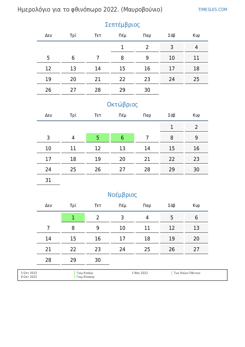 Λήψη και εκτύπωση ημερολογίου PDF με αργίες και σαββατοκύριακα για το φθινόπωρο του 2022 για το Μαυροβούνιο