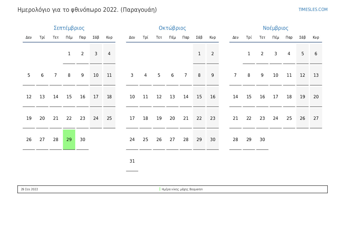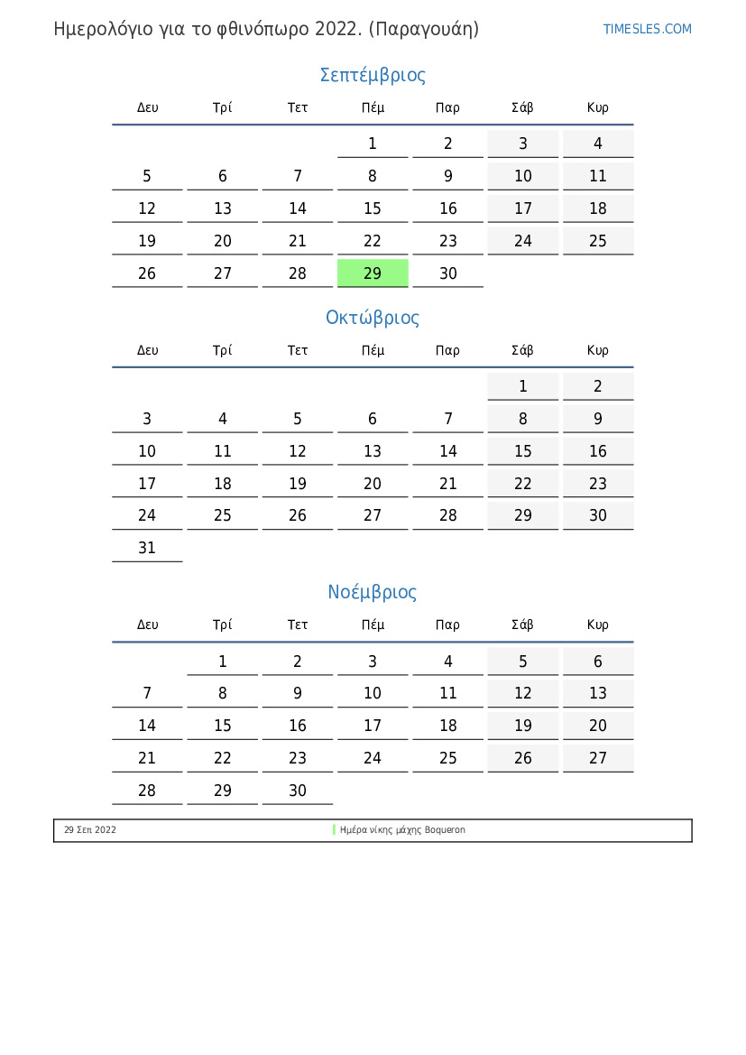 Ημερολόγιο για το φθινόπωρο 2022 για την Παραγουάη