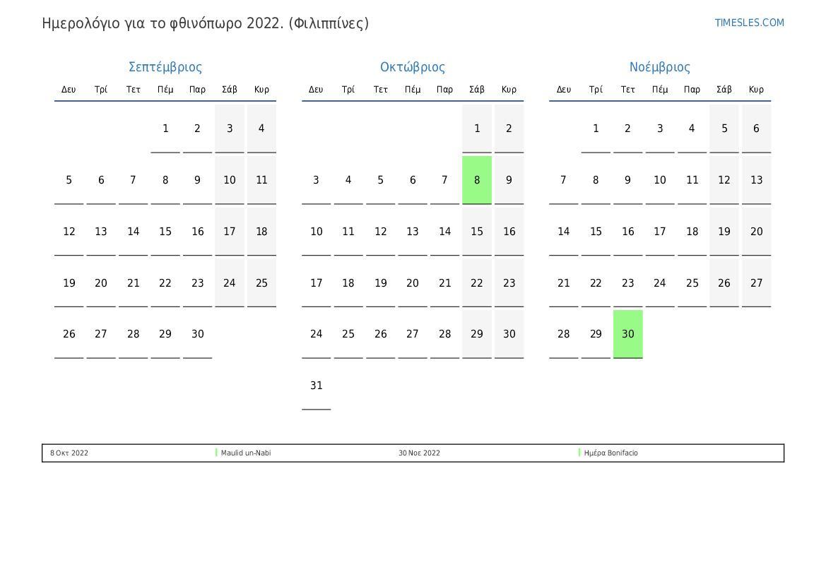 Ημερολόγιο για το φθινόπωρο 2022 για τις Φιλιππίνες