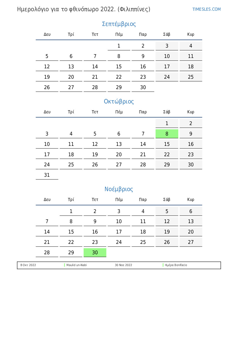 Λήψη και εκτύπωση ημερολογίου PDF με αργίες και σαββατοκύριακα για το φθινόπωρο του 2022 για τις Φιλιππίνες