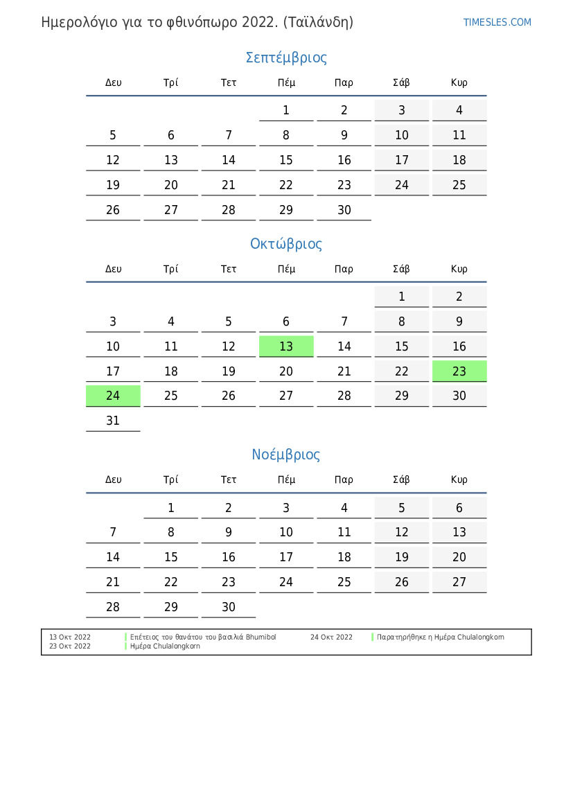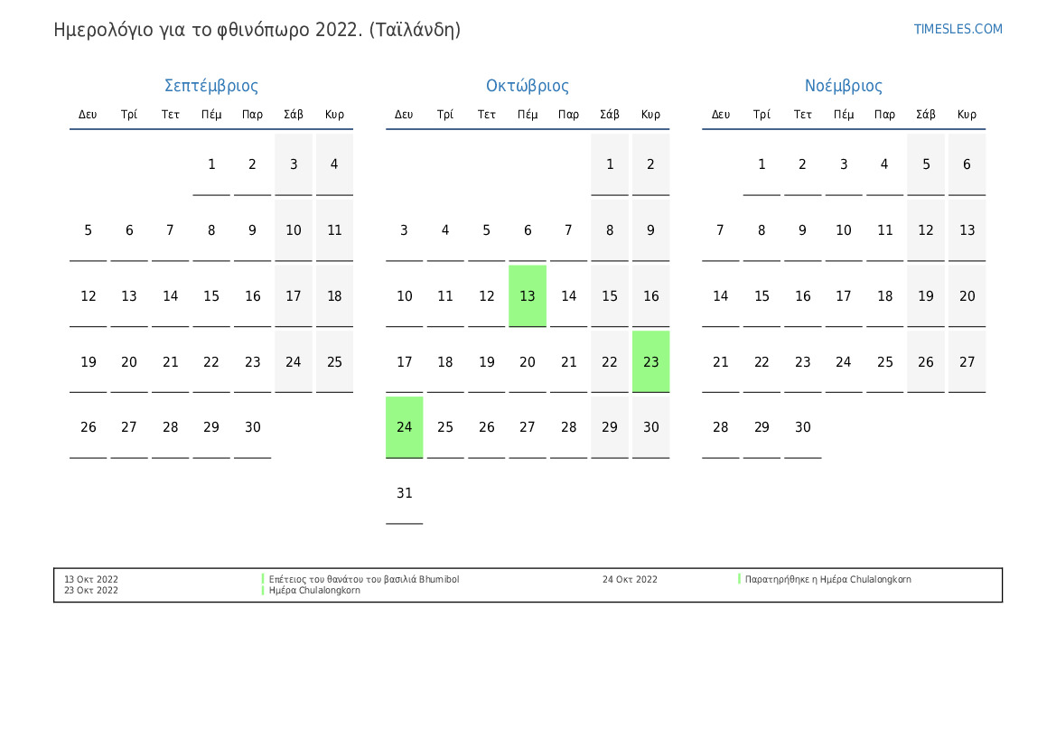Λήψη και εκτύπωση ημερολογίου PDF με αργίες και σαββατοκύριακα για το φθινόπωρο του 2022 για την Ταϊλάνδη