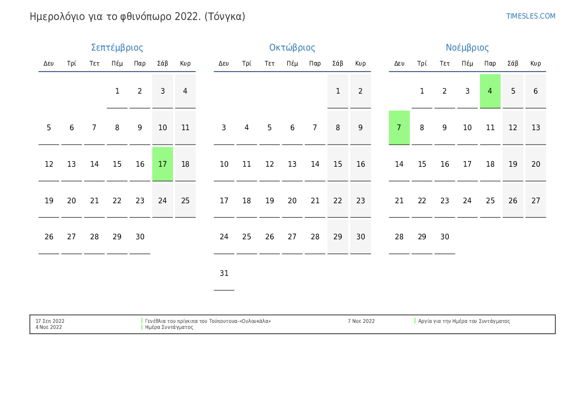 Λήψη και εκτύπωση ημερολογίου PDF με αργίες και σαββατοκύριακα για το φθινόπωρο του 2022 για την Τόνγκα