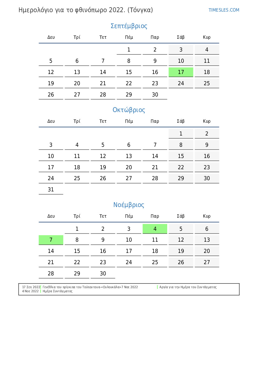 Ημερολόγιο αργιών και σαββατοκύριακων για το φθινόπωρο του 2022 για την Τόνγκα