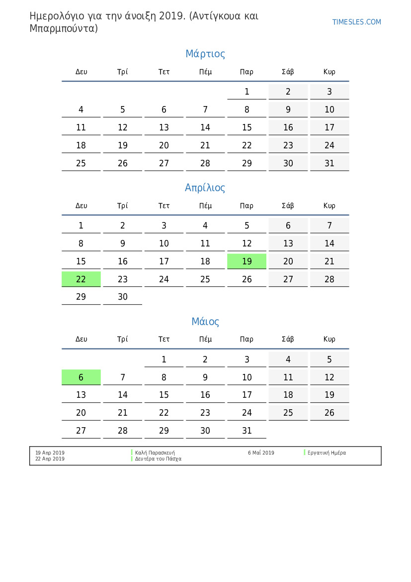 Ημερολόγιο αργιών και σαββατοκύριακων για την άνοιξη του 2019 για Αντίγκουα και Μπαρμπούντα