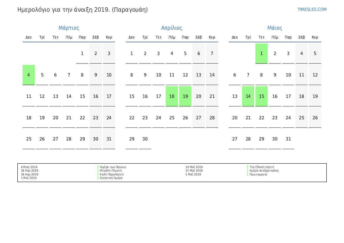 Ημερολόγιο αργιών και σαββατοκύριακων για την άνοιξη του 2019 για την Παραγουάη