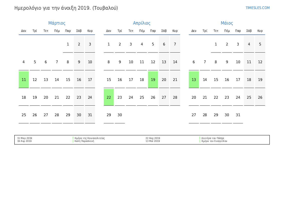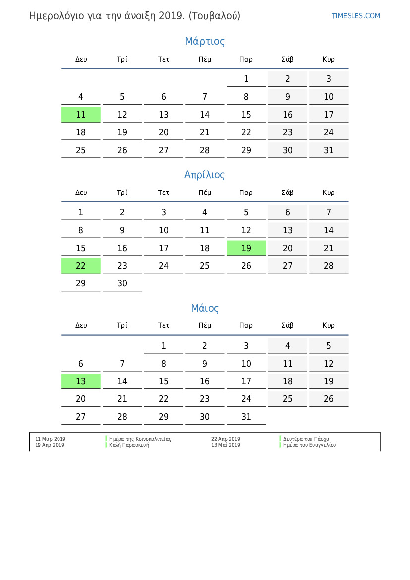 Λήψη και εκτύπωση ημερολογίου PDF με αργίες και σαββατοκύριακα για την άνοιξη του 2019 για το Τουβαλού