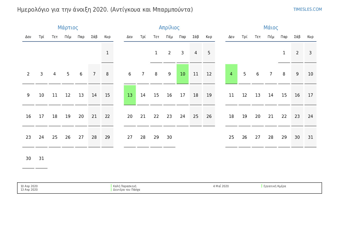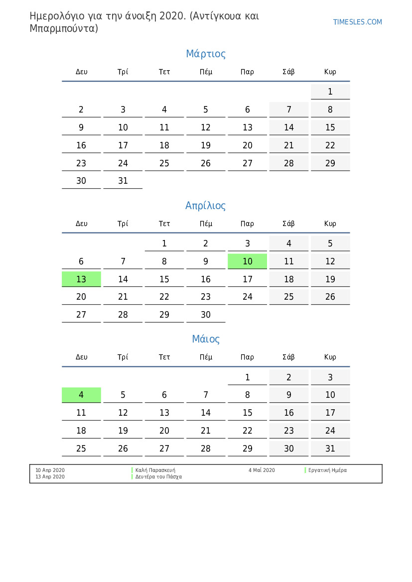 Ημερολόγιο αργιών και σαββατοκύριακων για την άνοιξη του 2020 για Αντίγκουα και Μπαρμπούντα