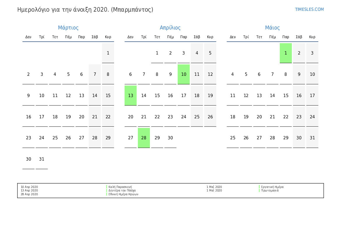 Λήψη και εκτύπωση ημερολογίου PDF με αργίες και σαββατοκύριακα για την άνοιξη του 2020 για τα Μπαρμπάντος