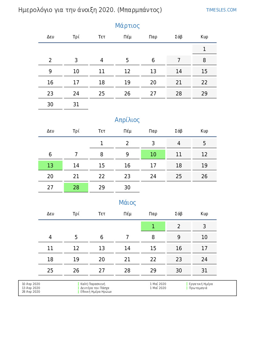 Ημερολόγιο αργιών και σαββατοκύριακων για την άνοιξη του 2020 για τα Μπαρμπάντος