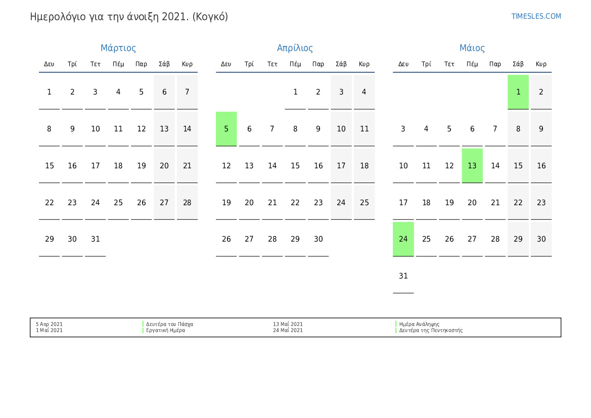 Λήψη και εκτύπωση ημερολογίου PDF με αργίες και σαββατοκύριακα για την άνοιξη του 2021 για το Κονγκό