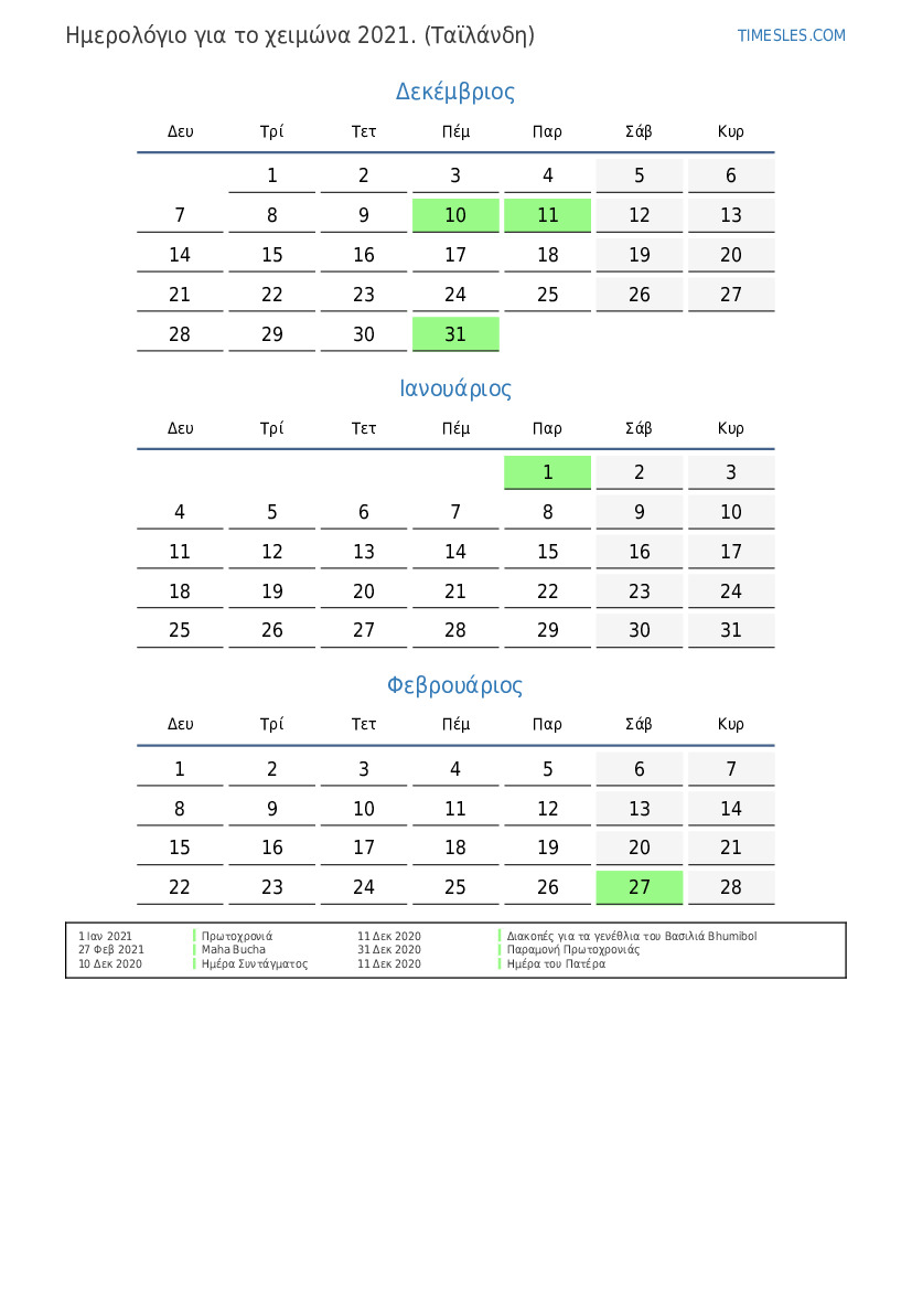 Ημερολόγιο για την άνοιξη 2021 για την Ταϊλάνδη
