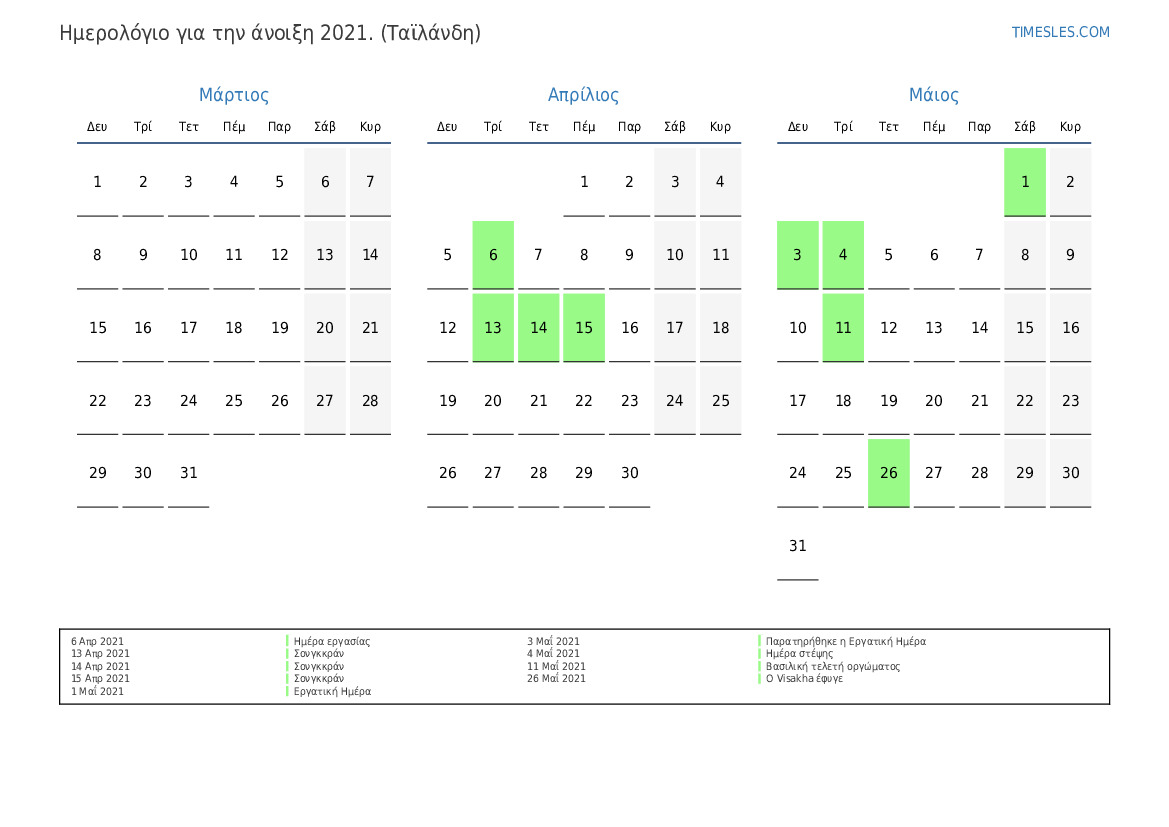 Λήψη και εκτύπωση ημερολογίου PDF με αργίες και σαββατοκύριακα για την άνοιξη του 2021 για την Ταϊλάνδη