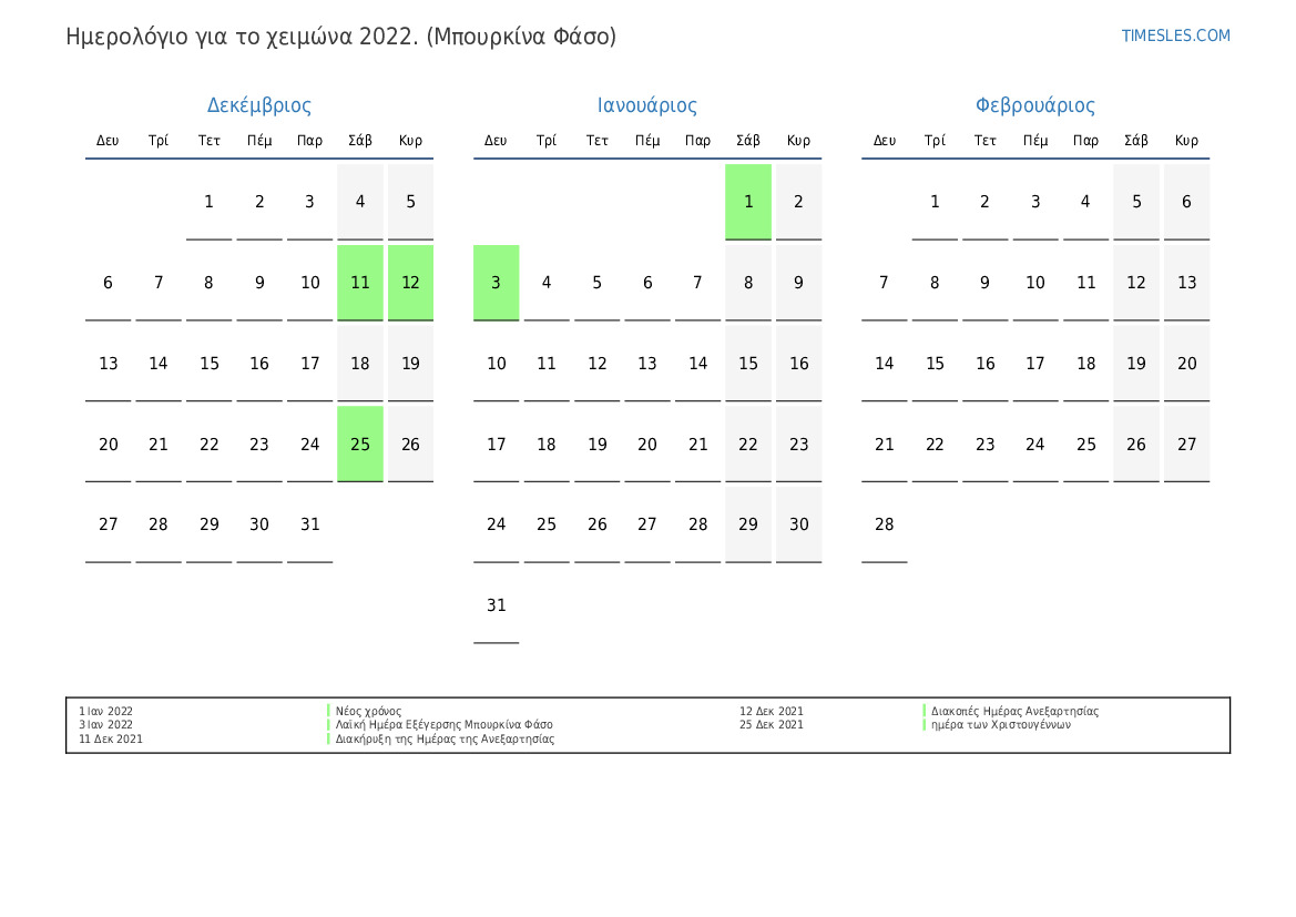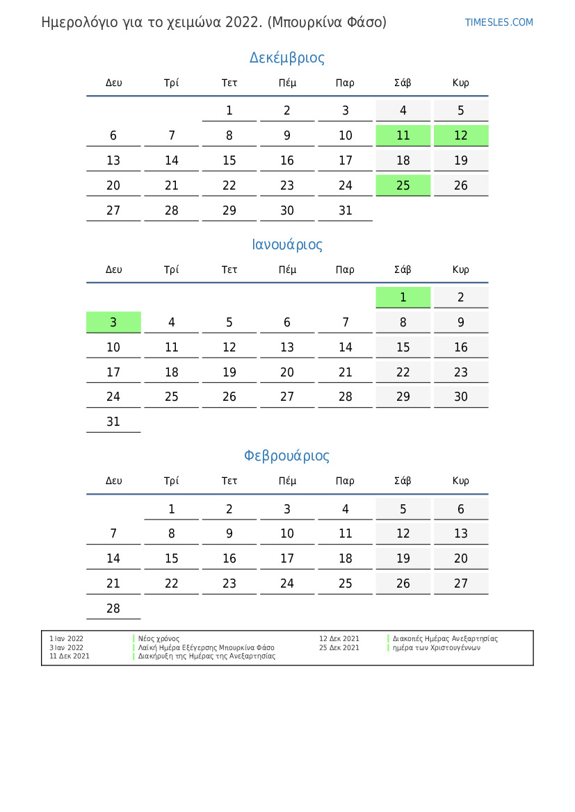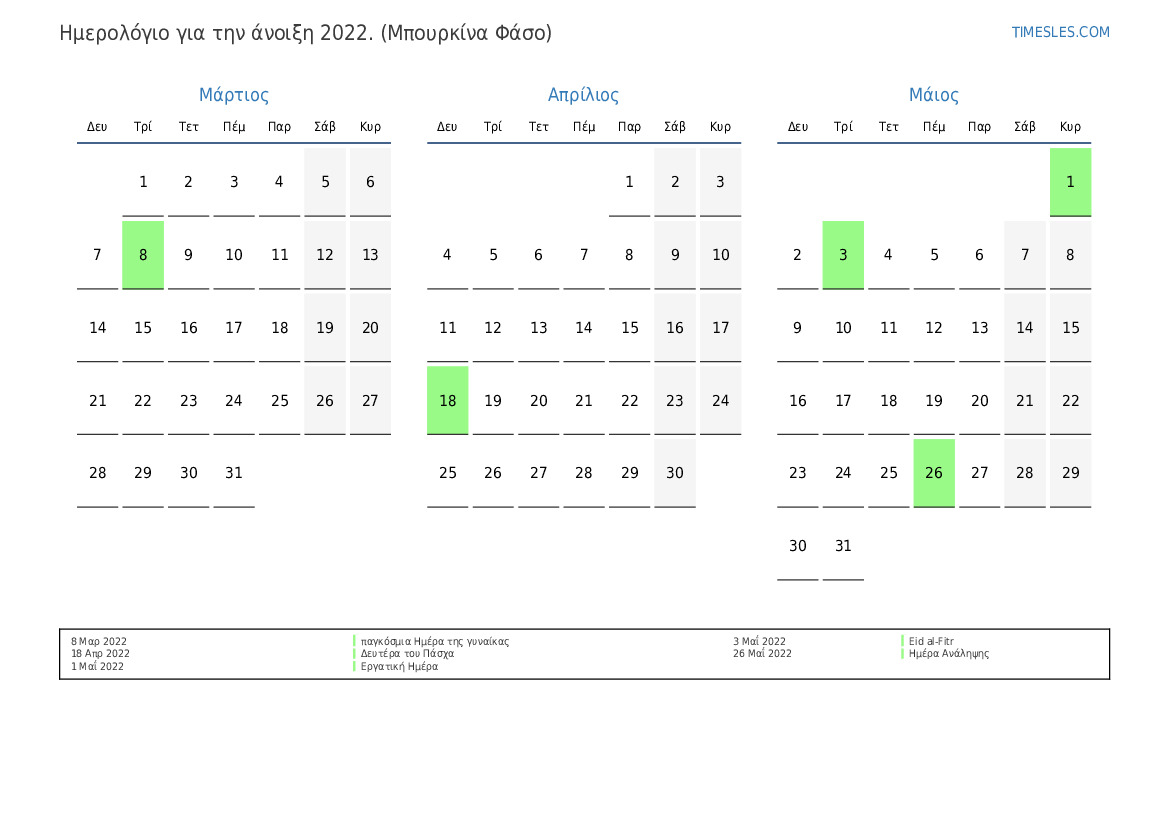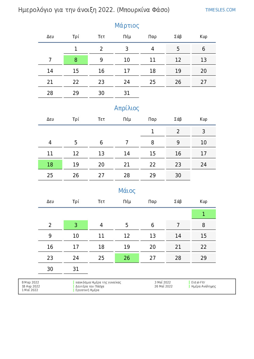Ημερολόγιο αργιών και σαββατοκύριακων για την άνοιξη του 2022 για την Μπουρκίνα Φάσο