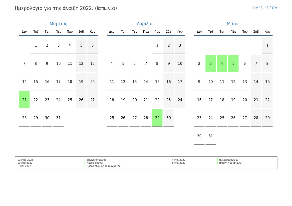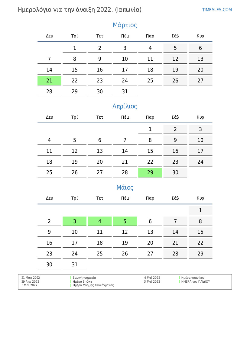 Λήψη και εκτύπωση ημερολογίου PDF με αργίες και σαββατοκύριακα για την άνοιξη του 2022 για την Ιαπωνία