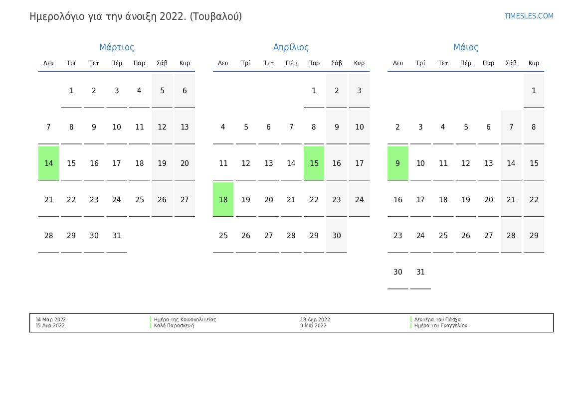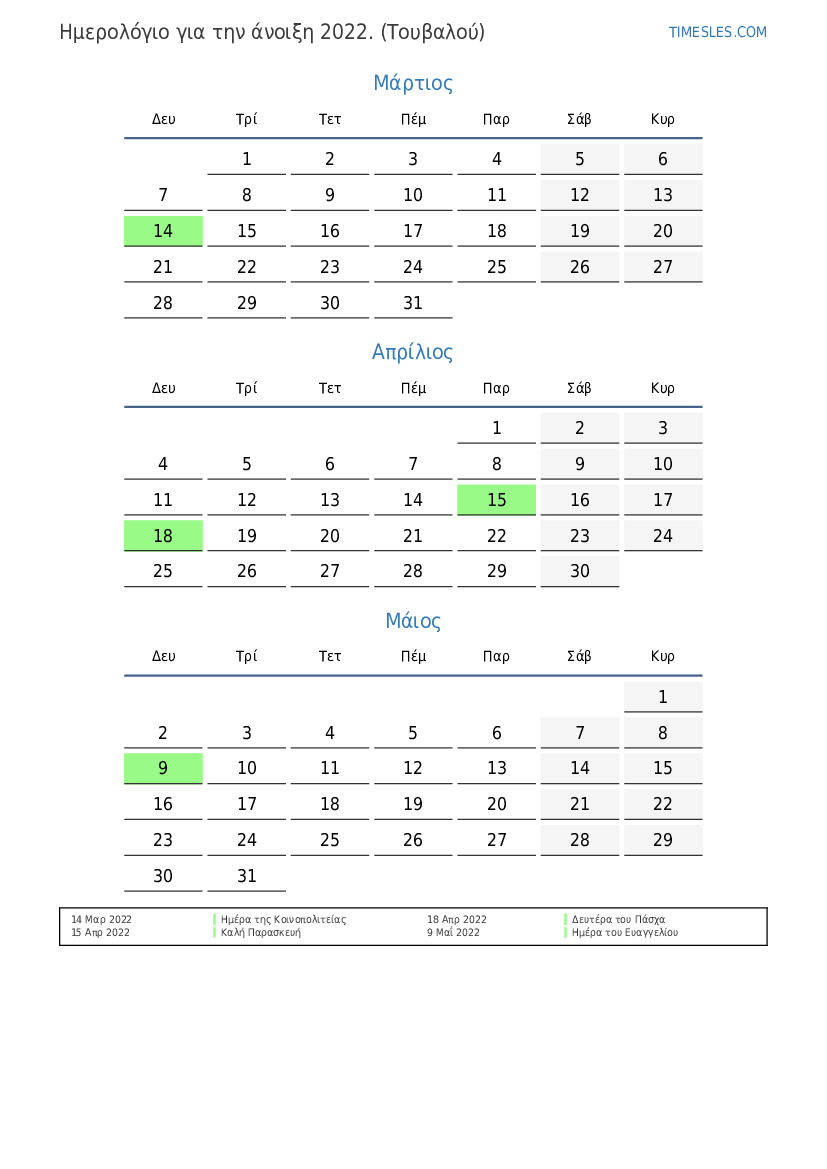 Λήψη και εκτύπωση ημερολογίου PDF με αργίες και σαββατοκύριακα για την άνοιξη του 2022 για το Τουβαλού