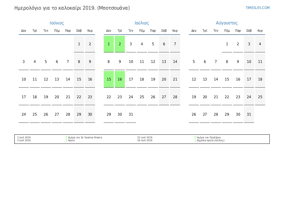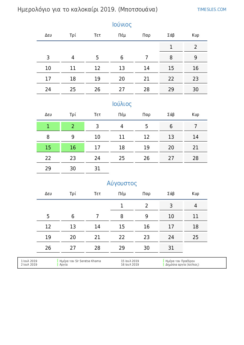 Ημερολόγιο αργιών και σαββατοκύριακων για το καλοκαίρι του 2019 για την Μποτσουάνα