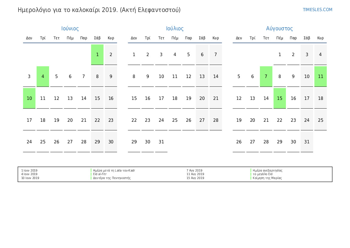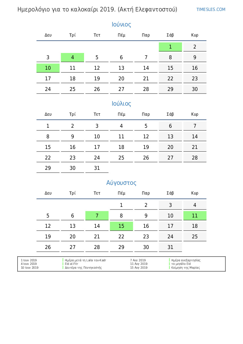Λήψη και εκτύπωση ημερολογίου PDF με αργίες και σαββατοκύριακα για το καλοκαίρι του 2019 για την Ακτή Ελεφαντοστού