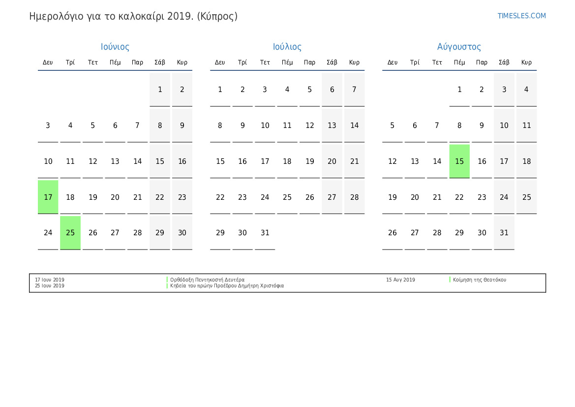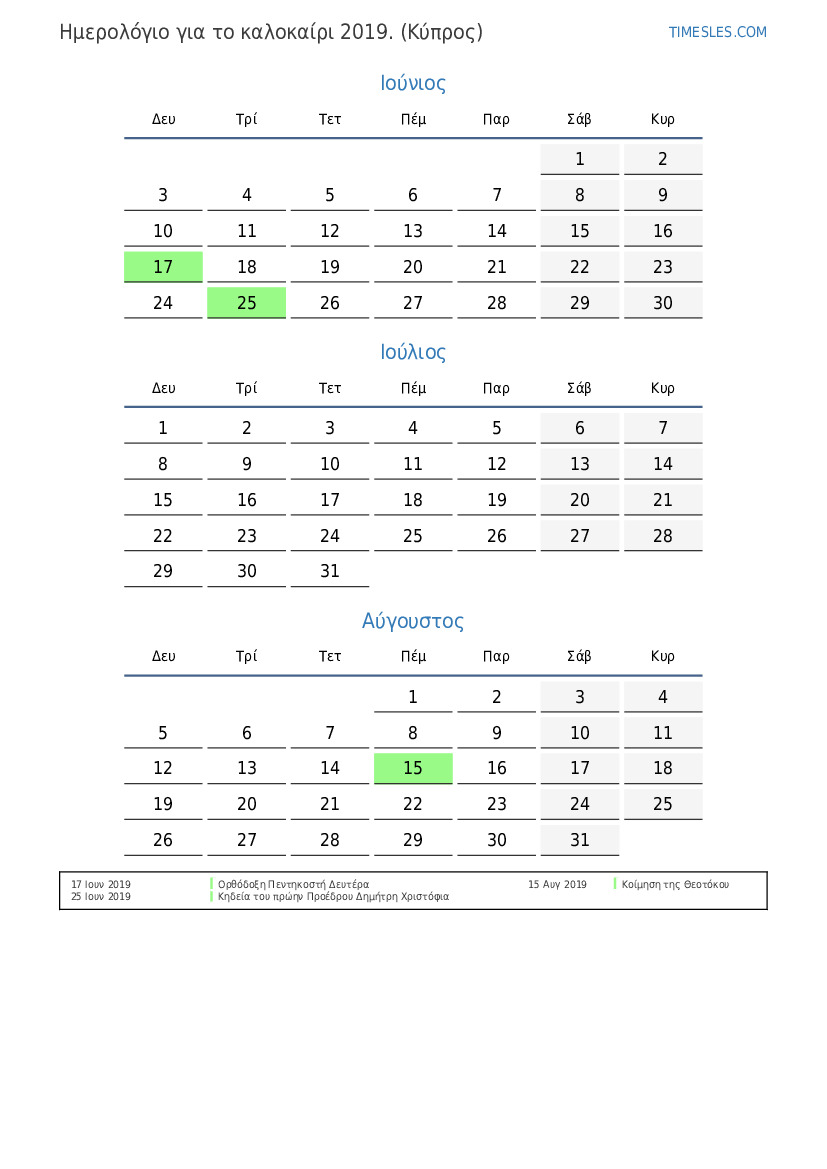 Λήψη και εκτύπωση ημερολογίου PDF με αργίες και σαββατοκύριακα για το καλοκαίρι του 2019 για την Κύπρο
