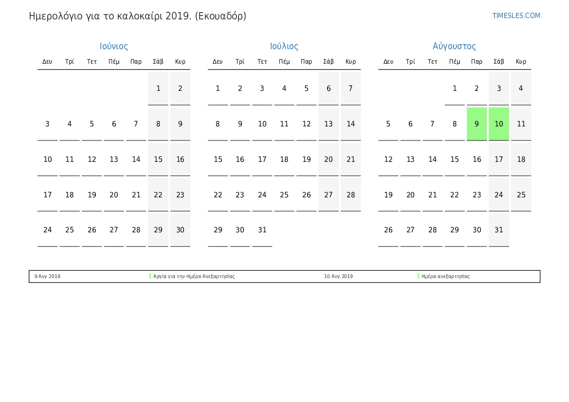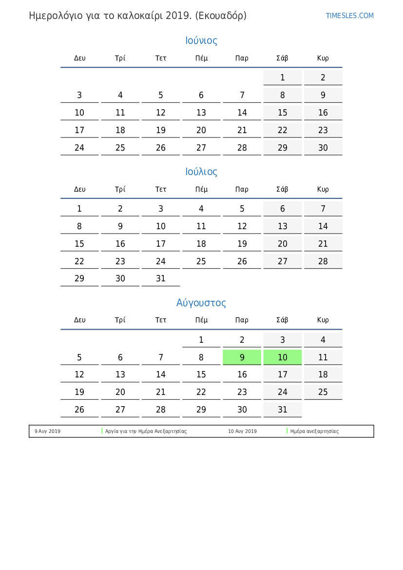 Ημερολόγιο αργιών και σαββατοκύριακων για το καλοκαίρι του 2019 για τον Ισημερινό