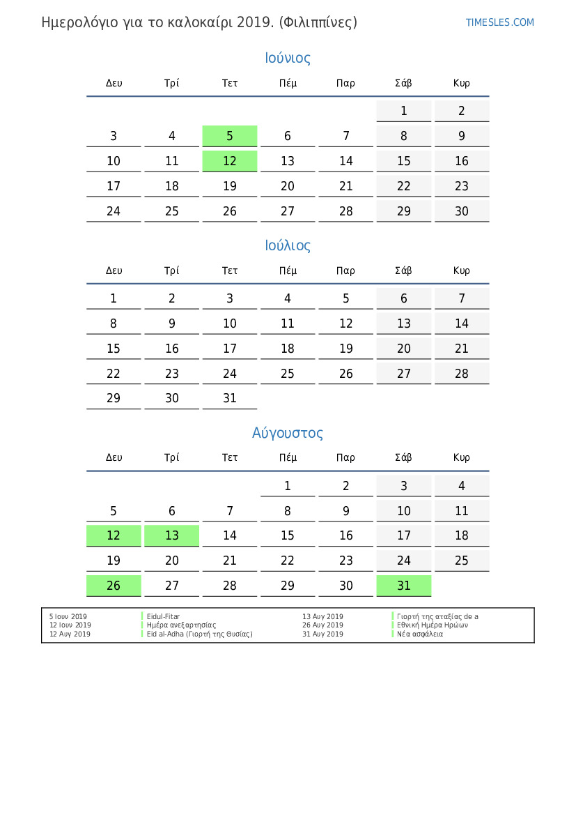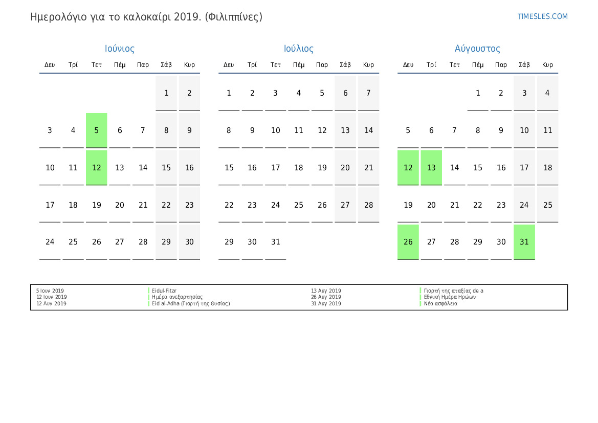 Ημερολόγιο αργιών και σαββατοκύριακων για το καλοκαίρι του 2019 για τις Φιλιππίνες