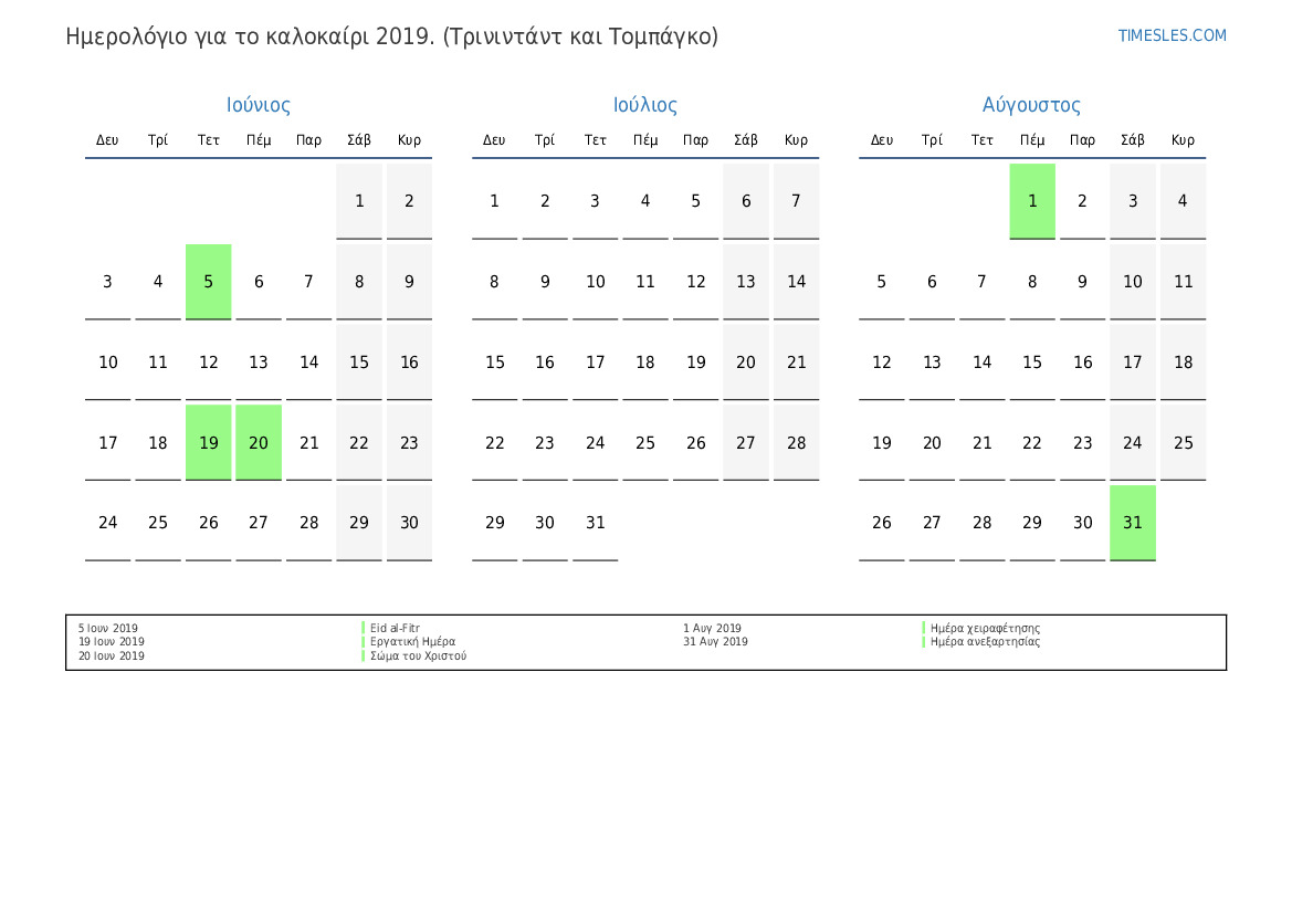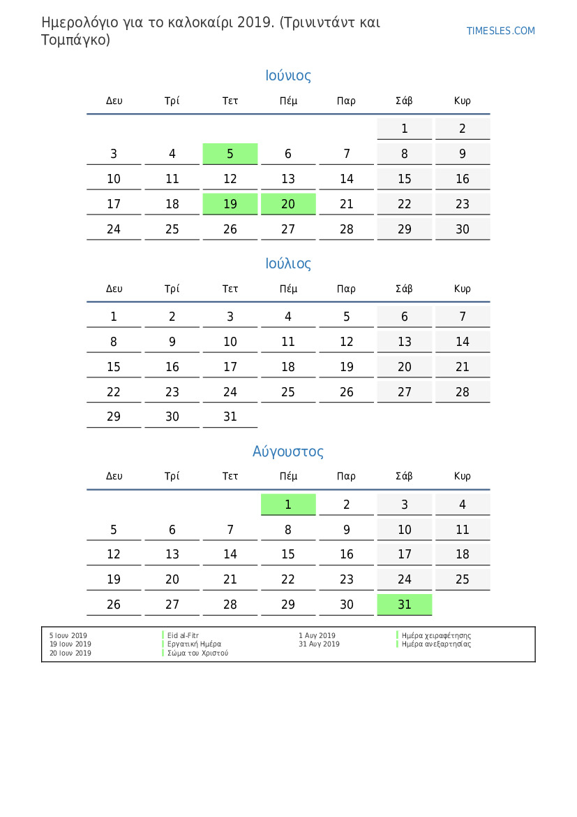 Ημερολόγιο αργιών και σαββατοκύριακων για το καλοκαίρι του 2019 για το Τρινιντάντ και Τομπάγκο