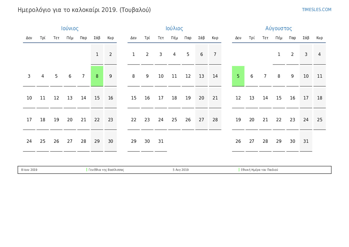 Λήψη και εκτύπωση ημερολογίου PDF με αργίες και σαββατοκύριακα για το καλοκαίρι του 2019 για το Τουβαλού
