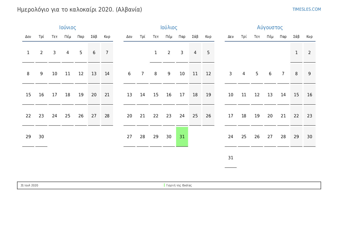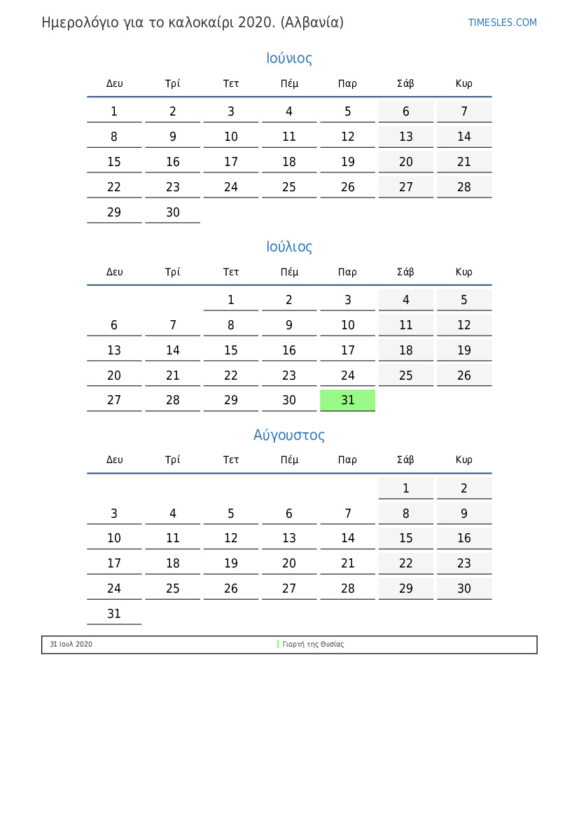 Λήψη και εκτύπωση ημερολογίου PDF με αργίες και σαββατοκύριακα για το καλοκαίρι του 2020 για την Αλβανία